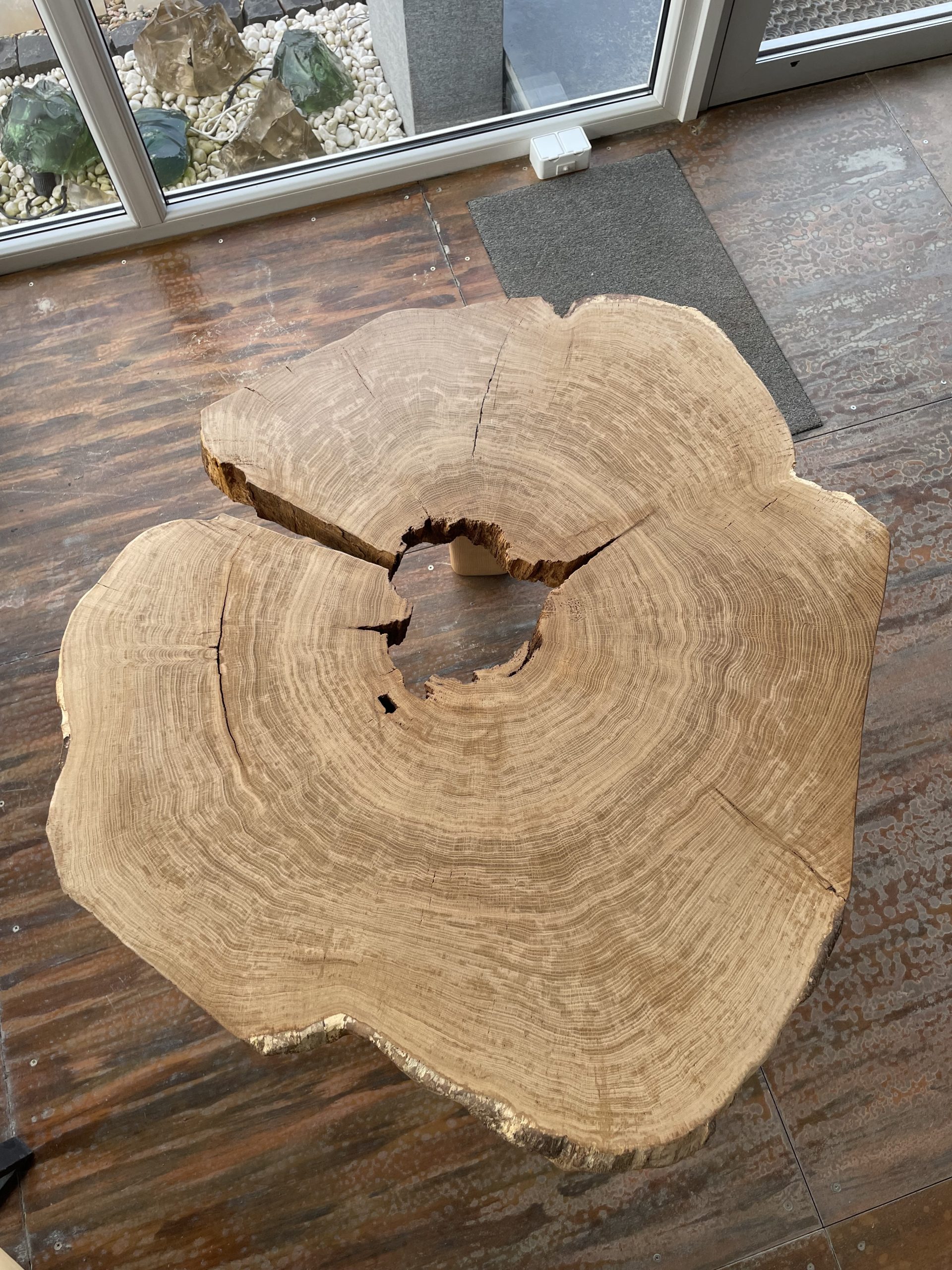 Oryginalny stolik kawowy z litego dębu wykonany z naturalnego plastra drewna. Każdy egzemplarz jest unikalny – zachowuje autentyczny rysunek słojów, pęknięcia oraz nieregularny kształt, co nadaje mu niepowtarzalny, rustykalny charakter. Solidny blat z grubego przekroju dębu osadzony jest na trzech stabilnych nogach z litego drewna, co zapewnia trwałość i stabilność.