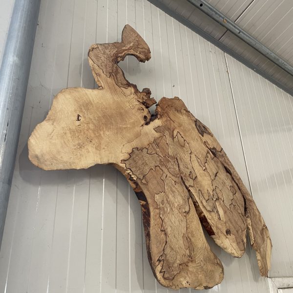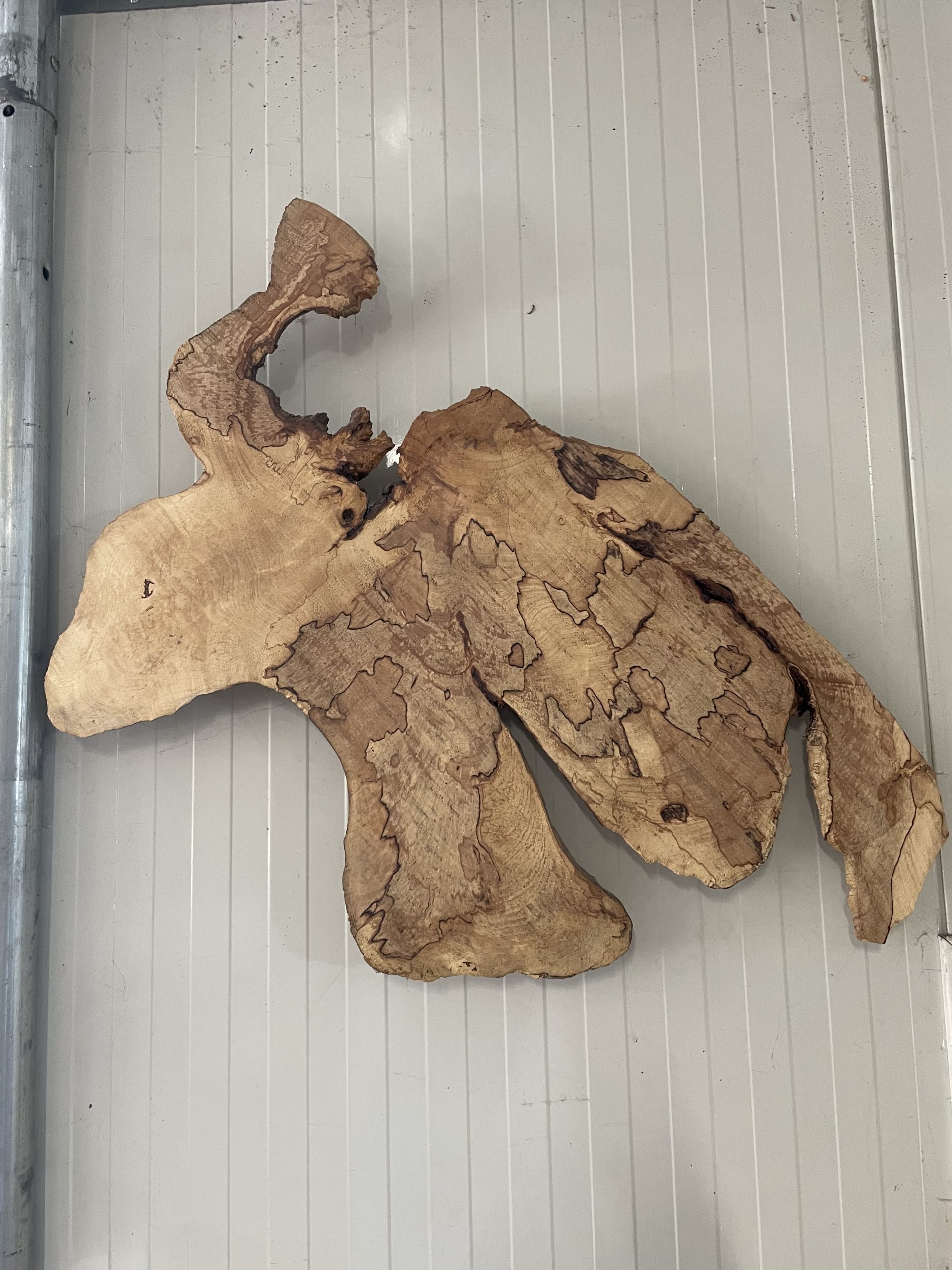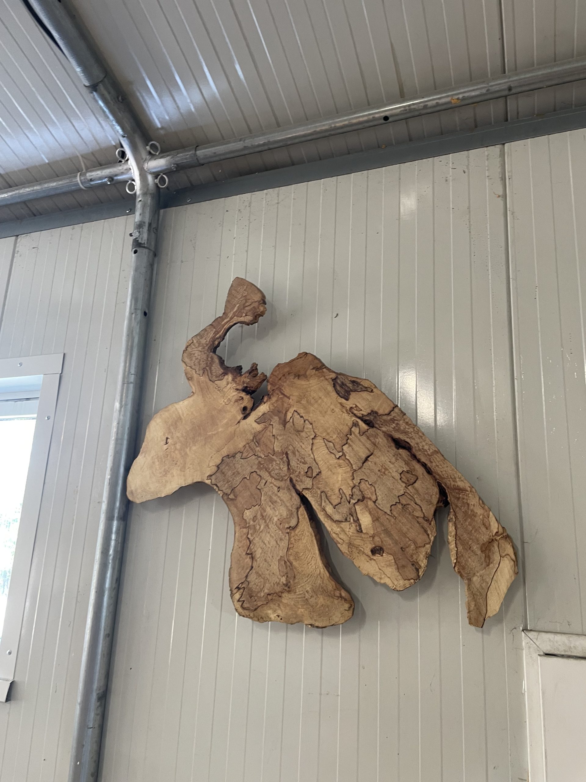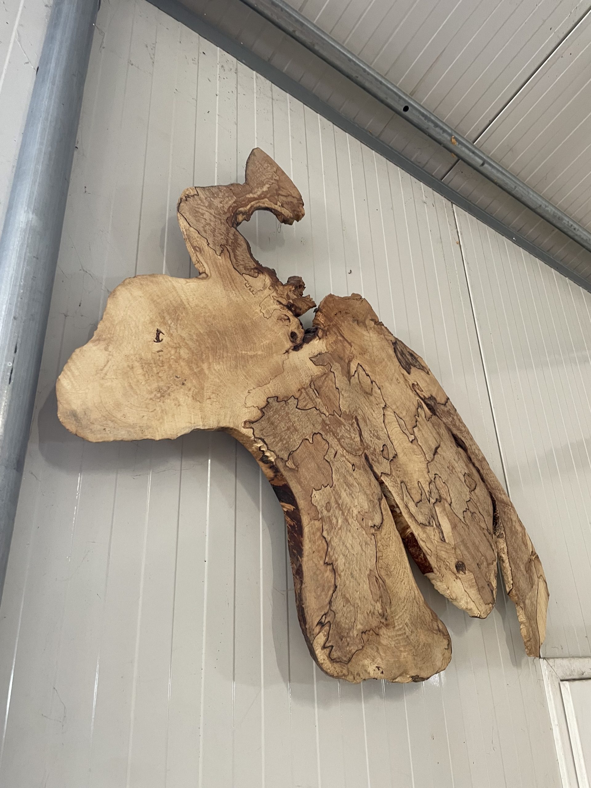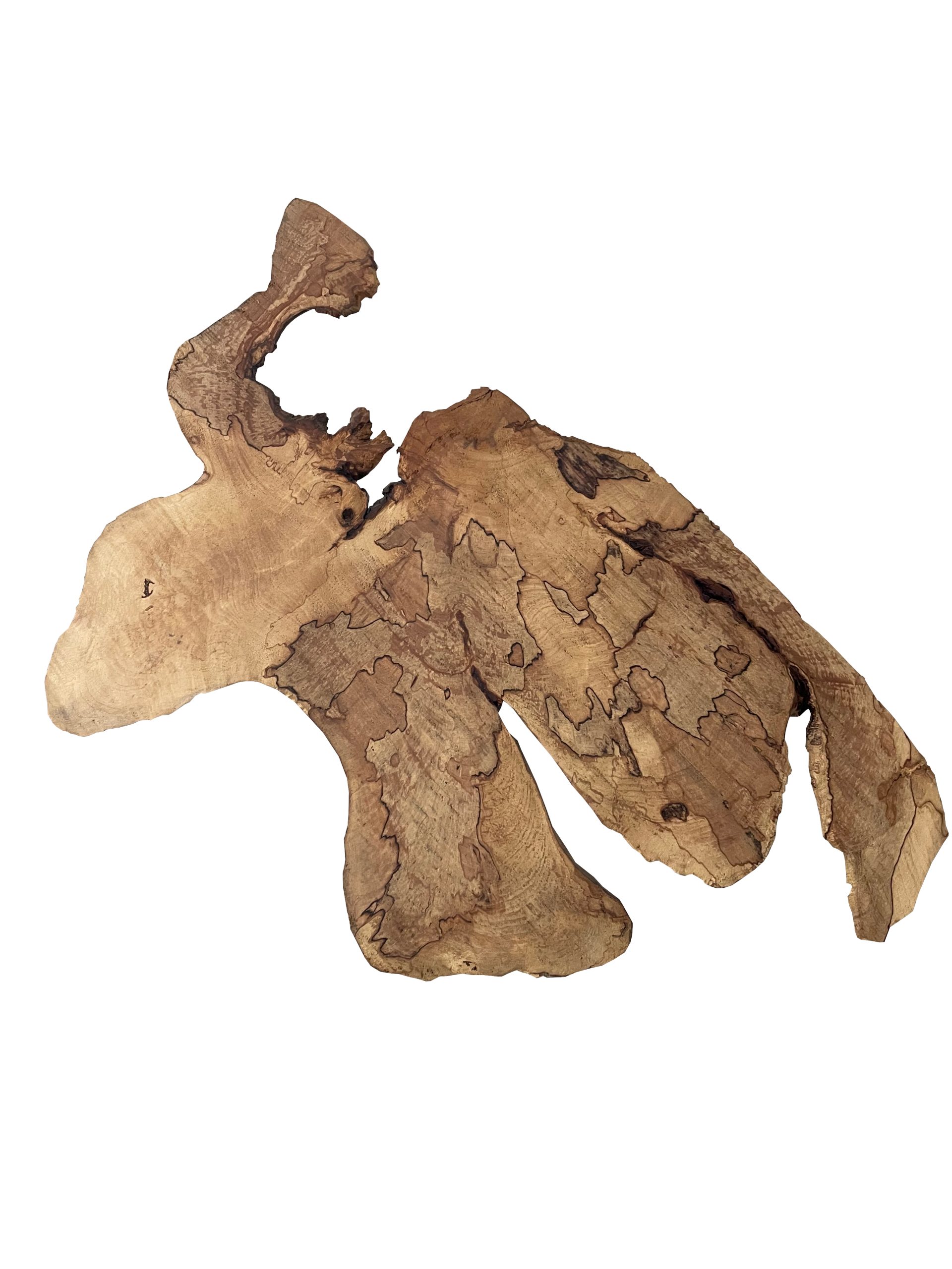 Ta niepowtarzalna rzeźba ścienna została wykonana z naturalnego kawałka drewna o wyjątkowej strukturze i nieregularnym, organicznym kształcie. Każdy detal opowiada historię natury – słoje, pęknięcia i kontrastowe przebarwienia tworzą niepowtarzalny obraz.