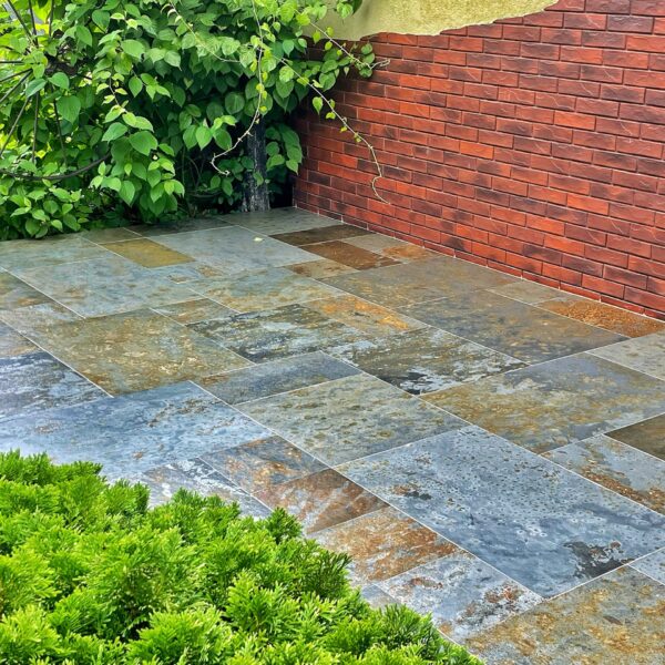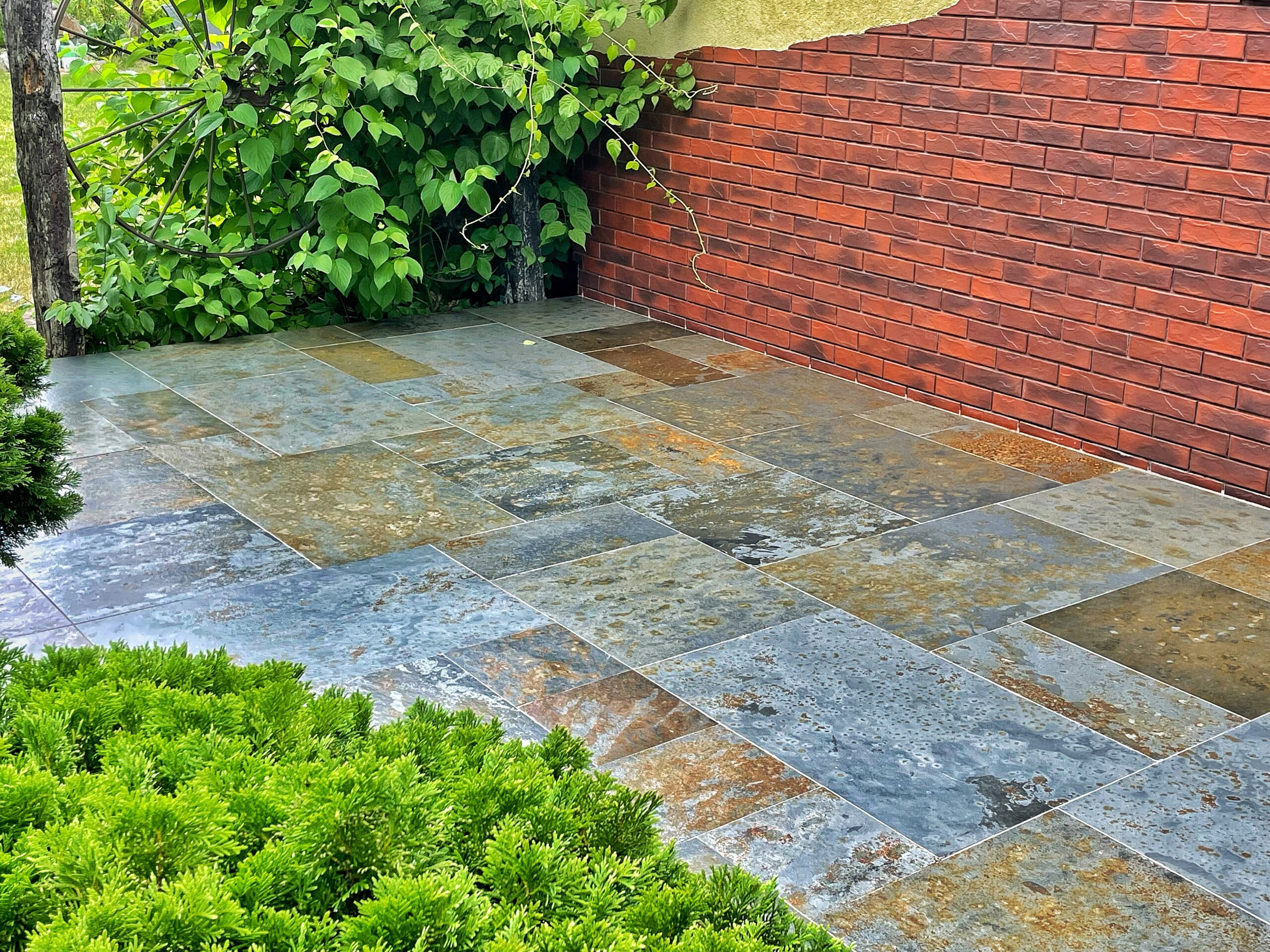 Wielokolorowe płytki z łupka brazylijskiego do zastosowania na taras o grubości 2 cm w formie układanki rzymskiej