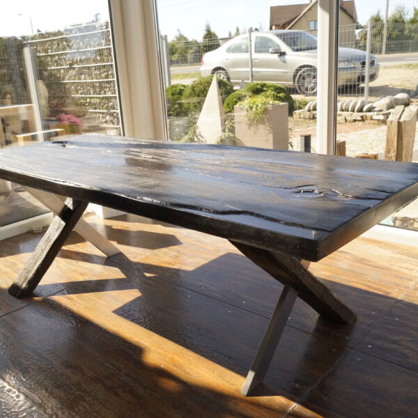 Ręcznie szlifowana i impregnowana powierzchnia, eksponująca naturalne słoje oraz głębię koloru czarnego dębu.