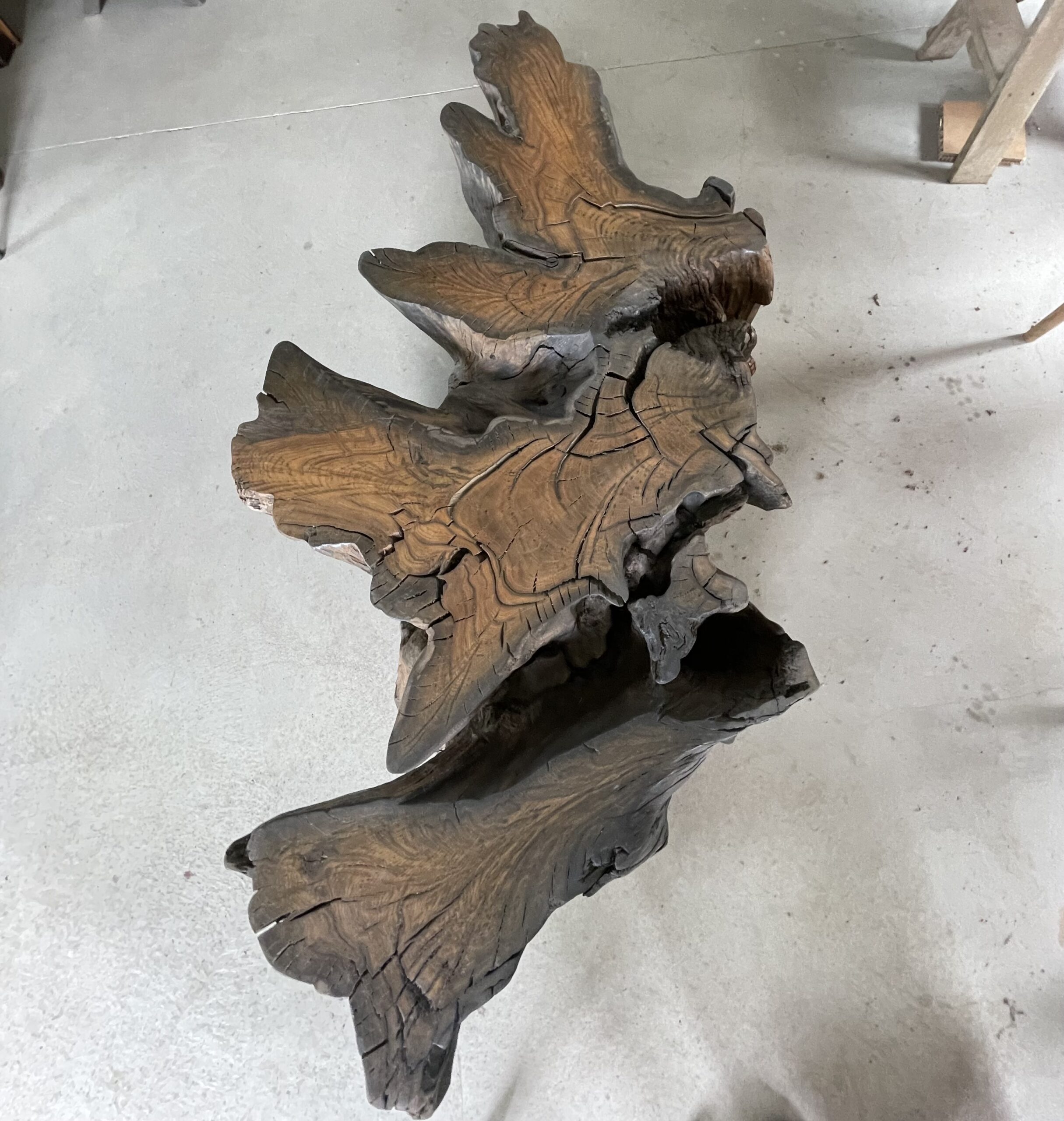 Nieregularna forma korzenia z zachowaniem naturalnych linii, pęknięć i struktur, które podkreślają autentyczność i charakter drewna.
